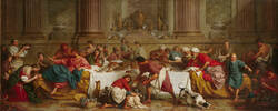 Subleyras tells the story of Jesus’ visit to Simon, a Pharisee who was well-disposed towards him. During the lavish meal that the host provides for his guest, a sinner washes Jesus’ feet with her tears and dries them with her hair. Jesus then forgives her all her sins. The onlookers are initially shocked and appalled by this. Jesus, however, appreciates the kindness shown to him by the woman more highly than Simon’s generous hospitality.