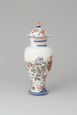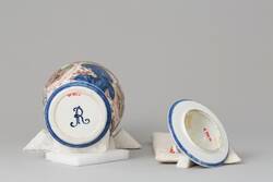 - Porcelain, painting: underglaze cobalt blue (sprayed ground colour), overglaze colours and gold