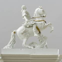 Johann Joachim Kaendler designed a larger-than-life equestrian statue of August III, King of Poland. In size and ambition, this monumental porcelain work would have far surpassed anything before it. In 1753, to give the king an idea of how it would look, Kaendler initially made a much smaller model. The allegorical figures around the base symbolise the king’s virtues, such as justice, faith, hope and love – just those qualities making a good ruler. The Seven Years War, though, put paid to Kaendler’s plans for this ambitious work and the statue remained just a model.