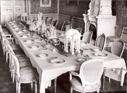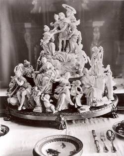 Эта группа фигур на круглом постаменте – лишь центральная часть большой столовой горки, длина которой изначально достигала семи метров. Ее преподнесли в дар курфюрсту Фридриху Августу III в декабре 1776 года, к его 26-летию. Ансамбль примечателен тем, что в нем сочетаются белый фарфор и саксонские самоцветы чудесных оттенков. Центральная группа восхваляет наиважнейшие добродетели молодого правителя: заботливость, милосердие и способность защитить своих подданных. Женские фигуры на цоколе олицетворяют различные виды искусства, процветающие при этом властителе.