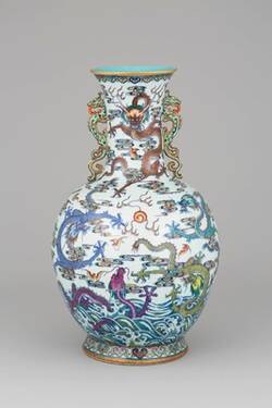 Ваза с фигурами драконов была изготовлена для двора императора Цяньлуна. Великолепные сосуды, расписанные императорскими символами, служили почетными дарами для высокопоставленных сановников.