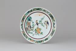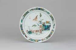 Каждая из этих четырнадцати тарелок на стене – шедевр китайской росписи по фарфору рубежа XVII-XVIII веков. Из-за преобладания в палитре разнообразных оттенков зеленого цвета такой тип декора получил название «famille verte» – «зеленое семейство». Сочетание искусно выполненной тончайшей росписи с изысканной композицией делает эти экспонаты жемчужинами нашей восточноазиатской коллекции, как с точки зрения технологии производства, так и в художественном отношении.