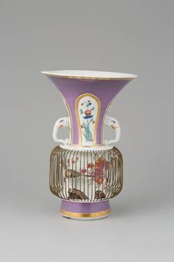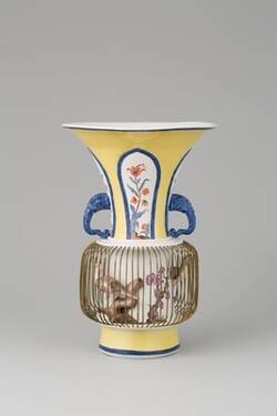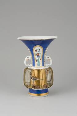 Примечательно, что в этом сосуде сочетаются два материала, которыми особо славится японское декоративно-прикладное искусство: фарфор и лак. Корпус вазы в форме рупора и ее ручки сделаны из фарфора, как и фигурки птиц за решеткой. Стрельчатые поля над клеткой и задняя ее стенка заполнены лаком уруси с позолотой.