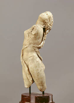 Эту фигуру, известную как дрезденская менада, обнаружили в конце 19-го века в городе Марино у озера Альбано, южнее Рима – в таком виде, в каком она предстаёт нам и сейчас. В первом веке нашей эры эта тогда еще неповрежденная танцующая менада, должно быть, украшала сад на вилле богатого римлянина.