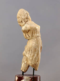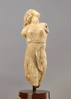 Известковые отложения и бесчисленные удары изувечили торс и лицо этой небольшой женской фигуры из мрамора. Кроме того, ей недостает обеих рук, а также носа и рта. И всё же в ней еще можно распознать танцовщицу. Голова женщины экстатично запрокинута, обнаженная левая нога отставлена далеко назад, а взгляд устремлен в небо – к бессмертному божеству, которому она поклоняется: Дионису, греческому богу вина, опьянения, экстаза и неистовства. В Древней Греции менадами называли женщин, которые, словно одержимые, плясали в честь Диониса.