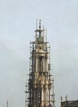 Именно таким, как на этой картине, увидел Дрезден Бернардо Беллотто, когда приехал из Венеции в город на Эльбе, чтобы занять пост придворного художника при Фридрихе Августе Третьем. Впрочем, вид был не совсем таким. Колокольни придворной церкви – Хофкирхе – которую вы видите на картине в лесах, тогда не существовало. Беллотто раздобыл планы архитектора и, недолго думая, добавил еще не построенное здание на полотно. Левее, на горизонте над мостом, виднеется купол Фрауэнкирхе – на момент создания картины ему было всего 5 лет.