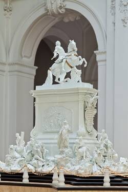 Иоганн Иоахим Кендлер работал над конной статуей Августа III, превышающей натуральную величину. Это монументальное скульптурное творение из фарфора своим замыслом и размерами призвано было затмить всё существовавшее прежде. Чтобы дать королю представление о задуманном памятнике, в 1753 году Кендлер сначала изготовил модель гораздо более скромной величины. Постамент украшают фигурные изображения монарших добродетелей, такие как Справедливость, Вера, Надежда, Любовь – то есть качества, отличающие хорошего правителя. Семилетняя война расстроила этот честолюбивый план, от которого осталась только модель.